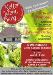 Das Megaevent am und im Weinberg von Kleinaspach. Direkt an der Kelter für euch, am Stand der https://www.wg-aspach.de/ ,musikalisch, im Einsatz