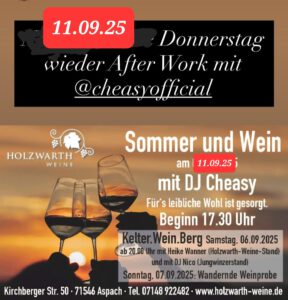 Mittlerweile bereits Kult. Die Top After-Work-Parties bei Holzwarth Weine in Kleinaspach. https://holzwarth-weine.de/ Nähere Infos folgen wie immer zeitnah